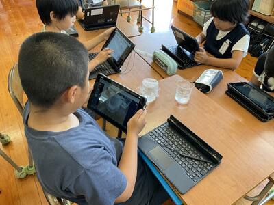 本日の理科は,「自然の中の水のすがた」を行いました。前回設置した2つのビーカーがどのように変化したかを観察し,結果をまとめ,考察を考えました。タブレットを使用し,絵や図を用いながら考察を考えていました。子どもたちは,「水は目に見えない小さなつぶになって空気中に出て行った。」と結論づけていました。