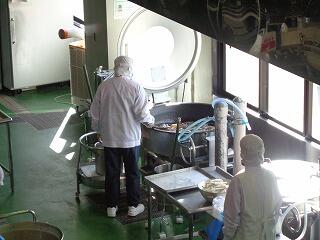 給食センターでは、所長さん、栄養教諭から給食センターのこと、給食ができるまでの手順等の話を聞いた後、調理室を見学しました。