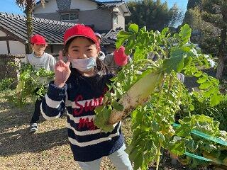 「大きな大根が採れた!食べるのが楽しみだな。」「白菜を使ってだご汁を作るの、とても楽しみ。」「お家に持って帰って皆で食べるのが楽しみだな。」と話しながら一生懸命収穫しました。