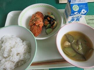 今日は、夏野菜のみそ汁でした。給食の味噌は、熊本県産の原料を使い、阿蘇の伏流水で作った無添加の甘口味噌だそうです。みなさんの健康を考えてありありがたいです。