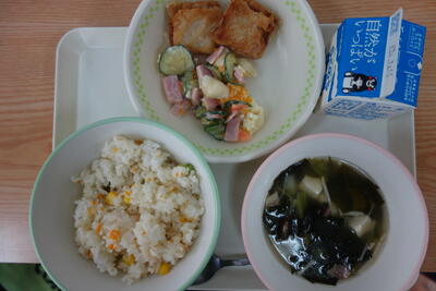 本日は、チンゲンサイのスープ、お魚ナゲット、マカロニサラダ、コーンピラフ、牛乳でした。