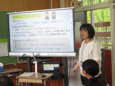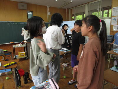 英語専科の前田先生に、表現を教えてもらい、お互いに英語を使ってやり取りをする活動をしました。