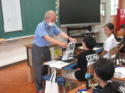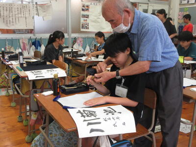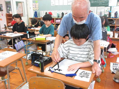 7月11日(木)、6年生が習字の授業で大里先生に指導をしていただきました。