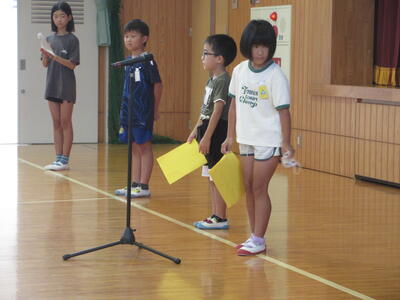 7月19日(金)、体育館で前期前半終わりの会を行い、各学年の代表が夏休みまでに頑張ったことや、夏休みと、夏休み明けに頑張る決意を堂々と発表してくれました。
