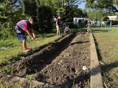 福山さんにお世話になり冬野菜を畑に植えました。2年生が朝から水やりをしています。育つのが楽しみです。