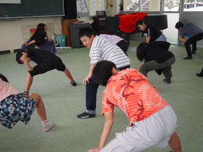 2年生は体育の授業で声をしっかり出して準備体操をしています。キビキビ動いて体操がしっかりできます。