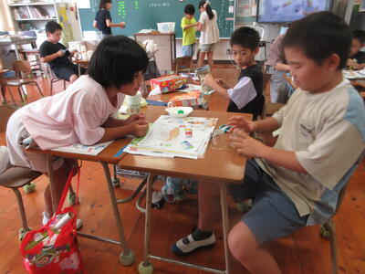 子供たちは、一日の授業について漢字を組み合わせて文章を作っていく学習を行い、互いに伝え合っていました。