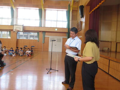 その後、校長先生から前期を終えてお話があり、集中して全児童が聞きながら、全校で前期の伸びを確かめ、後期への希望や意気込みを新たにしていました。