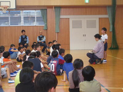 南関町の交番からも来ていただき、避難訓練を見てアドバイスを受けたり、児童に対して不審者に会ったときの心構えを話されました。