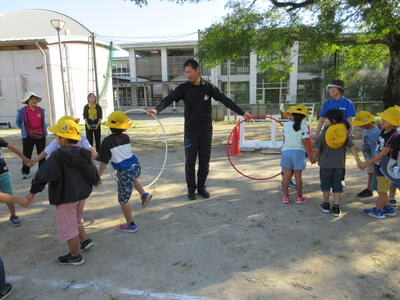 「よーい、スタート」で始めました。けんかやもめごともなく、ゲームをたのしむことができました。その後は、広い運動場で鬼ごっこを楽しみました。