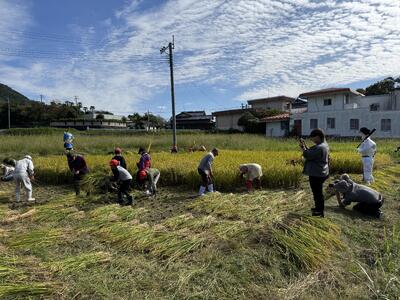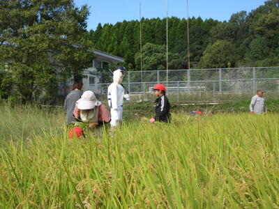 相谷区区長をはじめ区の皆様方や、婦人会の皆様方、地域学校協働活動でのボランティアの方々、保護者や南関町総務課など行政の方々など大勢の方のサポートや指南により、5年生は稲刈りを始めました。