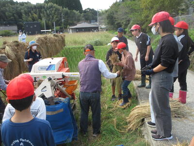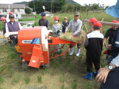 5年生が稲作体験学習を行ってきた田んぼで、福山さんと相谷区長さんや相谷区の方々に教えていただき、脱穀をしました。脱穀した後の藁は、束ねてトラックに積み込みました。