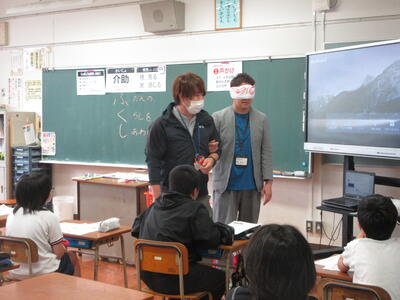 介助体験や目の不自由な方がどのような感覚になるのかを体験する学習を行いました。