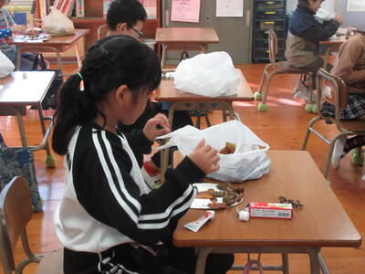 11月19日(火)、5年生は家庭科授業の調理実習で味噌汁を作りました。だしを使って本格的に味わい深い味噌汁ができていました。なかなか味わえない本格だしの味噌汁には、先日全校児童で芋掘りをした甘くておいしいさつまいもや南関あげが入っており、最高の一品でした。