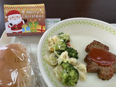 給食にもみの木ハンバーグと