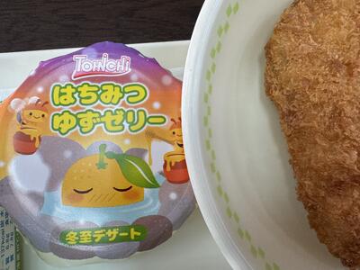 給食で冬至デザートとして、はちみつゆずゼリーが出されました。