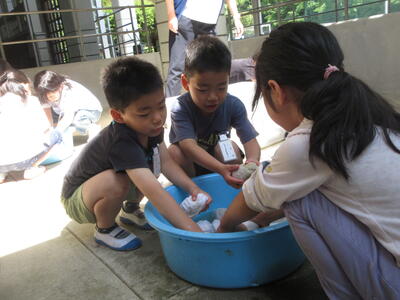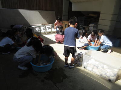 5月27日、1年生は運動会で使った玉入れの球をきれいに洗いました。来年の1年生がまた使います。
