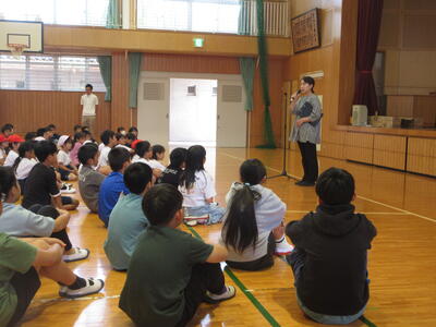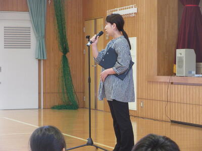 生徒指導担当の塩塚先生から、最近の学校生活や下校後の生活の問題点をお話しされました。その後に、人権教育主任の岡田先生から、自分や相手や者を大切にしていない、命を大切にしていないことへの心配が話されました。