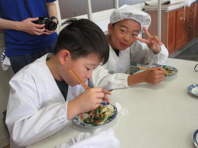 どの野菜もていねいに上手に切ってあり、ほどよい油と火加減でシャキシャキ感も残しつつ、野菜の甘みを感じて頂くことができました。途中の片付けなどテキパキと動いて協力する力をいかんなく発揮する姿はさすが6年生でした。