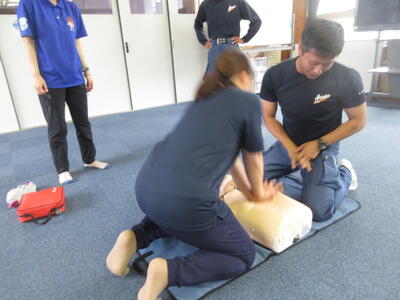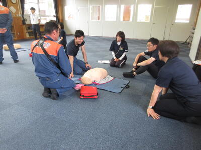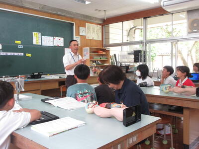 これから水泳の授業が始まる前に、職員全員が受講する救命救急講習を南関第三小学校のみんなのホールで実施しました。