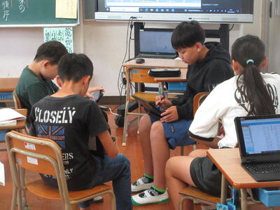 1年生はタブレット端末を持ち寄り意見交換をしています