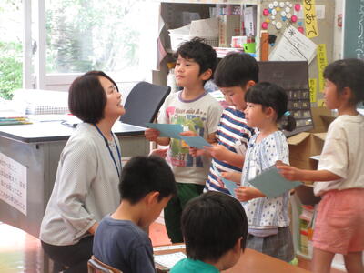 写真は図書委員会から1年生の代表に表彰状が渡されました様子です。