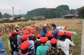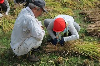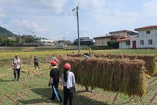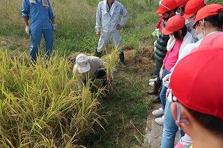 相谷の地域の方に来ていただき、いねかりの指導とサポートをしていただきました。また、保護者の方や町役場の方もサポートに来てくださいました。