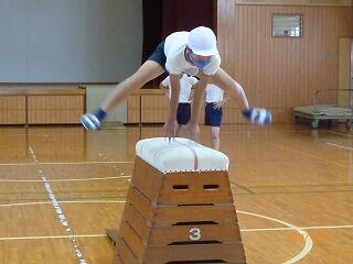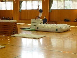 マットで前転、後転に取り組んだ後、とび箱にチャレンジしました。この写真は開脚跳びの様子です。