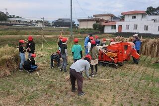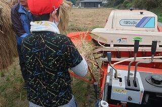 今回は脱穀機を使いました。安全に使うよう、指導をいただいています。