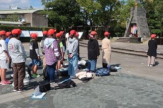 長崎市へ到着後,平和講話を聞きました。戦争の災禍や原子爆弾の被害,被災者の苦しみといった話を,子どもたちは真剣に受け止めていました。講話の後,平和祈念像の前で平和集会をしました。子どもたちの堂々とした声と歌声が,平和公園に響きました。