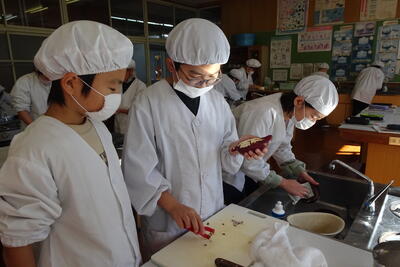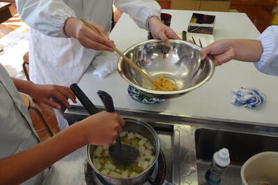 5年生は、家庭科の時間にお味噌汁を作りました。わくわくしながら、いりこからの出汁をとりました。上手に出汁をとり、旨みたっぷりの味噌汁を作ることができました。もちろん、「実」は南関あげと、それに、収穫したさつまいもでした。「おいしい!」「おいもが甘い~。」の声、声。満足した様子でした。