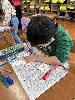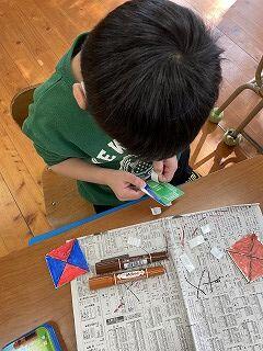 1年生は図工の時間で「ぶんぶんごま」を作りました。