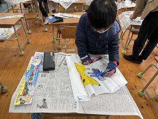凧を作っています。好きな絵をかいて、お気に入りの凧にします。