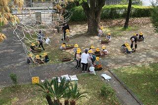 ある昼休みにふと外を見てみると2年生の子どもたちが落ち葉掃除をしていました。