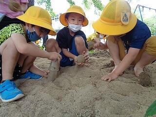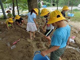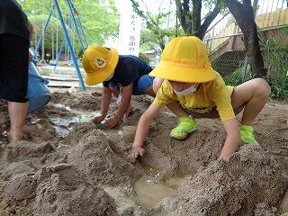 初めて学校の砂場を使う1年生もおり、友達と作品作りを楽しみました。