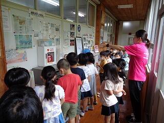 職員室前へ行き、災害備蓄用のビスケットや保存水を見ました。