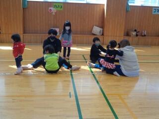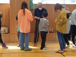 1年生の子どもたちは、お家の方と一緒に体操をしたり、昔遊びをしたりしました。