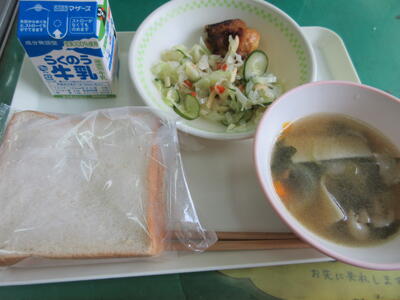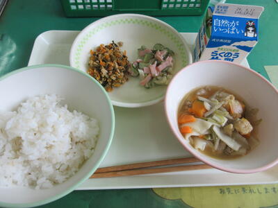 今日のメニューは、台風の影響で8月29日のメニューでした。中華丼とバンサンスー、しゅうまいの中華メニューをおいしくいただきました。給食センターは停電になったそうです。大変な中、おいしい給食をつくってくださりありがたいです。