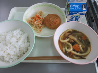 今日はカレーうどんでした。カレーうどんは、もともと日本料理のそば屋さんが日本の「うどん」とインドの「カレー」を、それぞれの国の良いところを取り入れて作ったのが始まりだそうです。