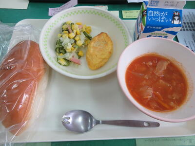 今日はミネストローネでした。ミネストローネは、イタリアの代表的なスープです。イタリア語で「具だくさん」「ごちゃまぜ」という意味だそうです。今日のミネストローネには、8種類の野菜が入っていました。野菜がたくさんとれておいしいスープでした。