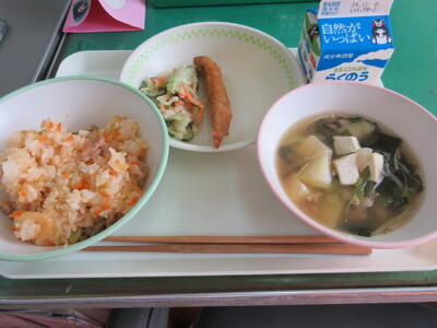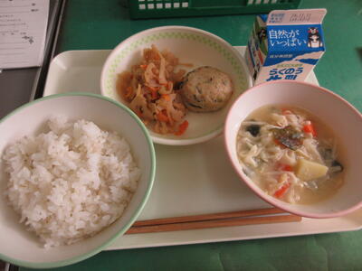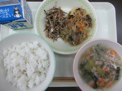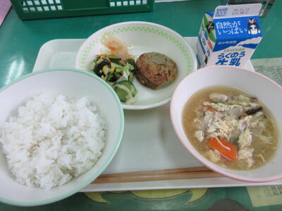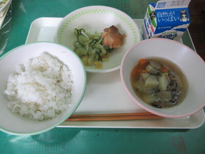今日は、ふるさとくまさんデーで、人吉・球磨地方の郷土料理でした。栗ご飯、つぼん汁、野菜の梨たれあえでした。栗が甘くておいしかったです。