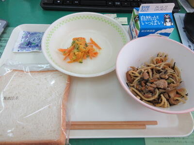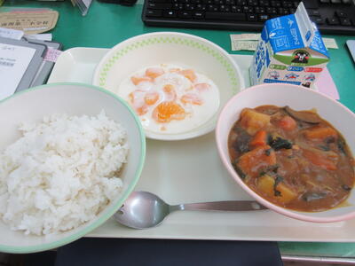 今日は、目の愛護デーでしたので、「瞳キラキラカレー」でした。目に良いビタミンAやカロテンを多く含むかぼちゃ、にんじん、ほうれんそうが入っていました。食べ物から目を守ってください。