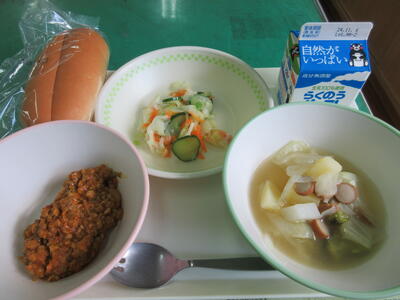 今日は、ポークビーンズでした。ポークビーンズは、アメリカの代表的な家庭料理のひとつです。成長期の子どもたちに必要なタンパク質が豊富にとれます。