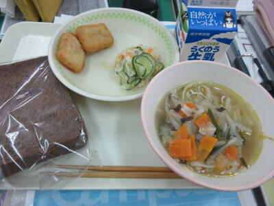 今日は、目の愛護デーでしたので、「瞳キラキラカレー」でした。目に良いビタミンAやカロテンを多く含むかぼちゃ、にんじん、ほうれんそうが入っていました。食べ物から目を守ってください。