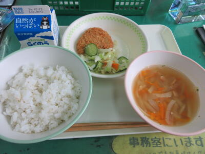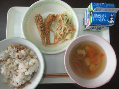 今日は、ふるさとくまさんデーで、人吉・球磨地方の郷土料理でした。栗ご飯、つぼん汁、野菜の梨たれあえでした。栗が甘くておいしかったです。