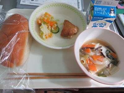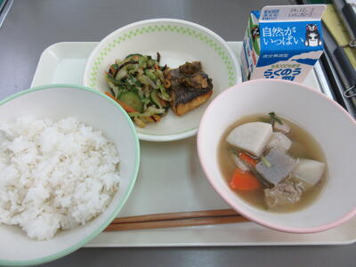 今日は、かしわ汁でした。かしわ汁は、大分県の郷土料理のひとつです。鶏肉とごぼうが入った醤油味の汁物のことだそうです。体が温まりました。