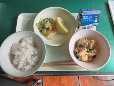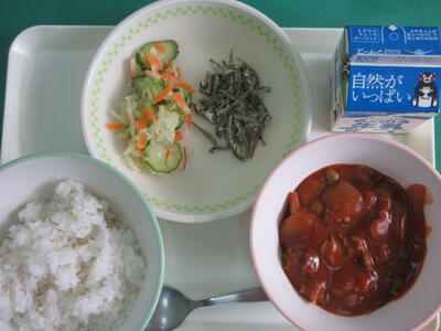 今日は、ふるさとくまさんデーでした。宇城地区の伝統的な料理、びりん飯、レンコンチップがありました。びりん飯は、具だくさんでおいしかったです。