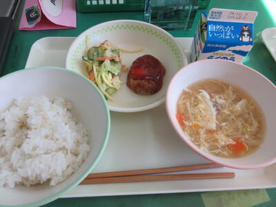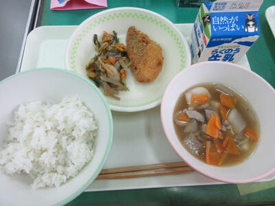 今日は、ごぼうを使ったハンバーグでした。ごぼうの食物繊維は消化されずにおなかの中を通過するので、胃や腸をきれいに掃除してくれる働きがあります。また、昔からむくみなどを取る漢方薬としても使われています。