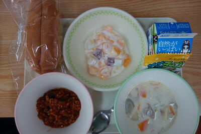 本日は、根菜クリームスープ、チリコンカン、フルーツヨーグルト、コッペパン、牛乳でした。