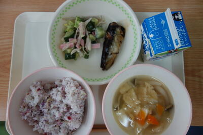 本日は、とうふ汁、いわしの甘露煮、梅マヨサラダ、梅じゃこごはん、牛乳でした。